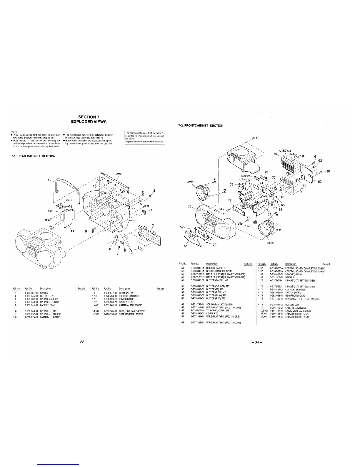 Sony CFD-370 - Exploded Views - Cabinet and Chassis; Rear and Front Cabinet Exploded Views; CD Chassis Exploded View