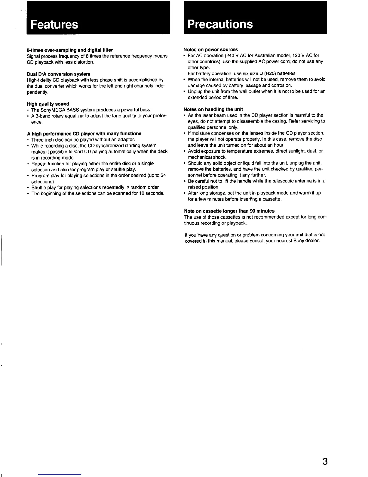 Sony CFD-440 - Product Features; Key Features Overview; Precautions and Notes; Power Source Guidelines