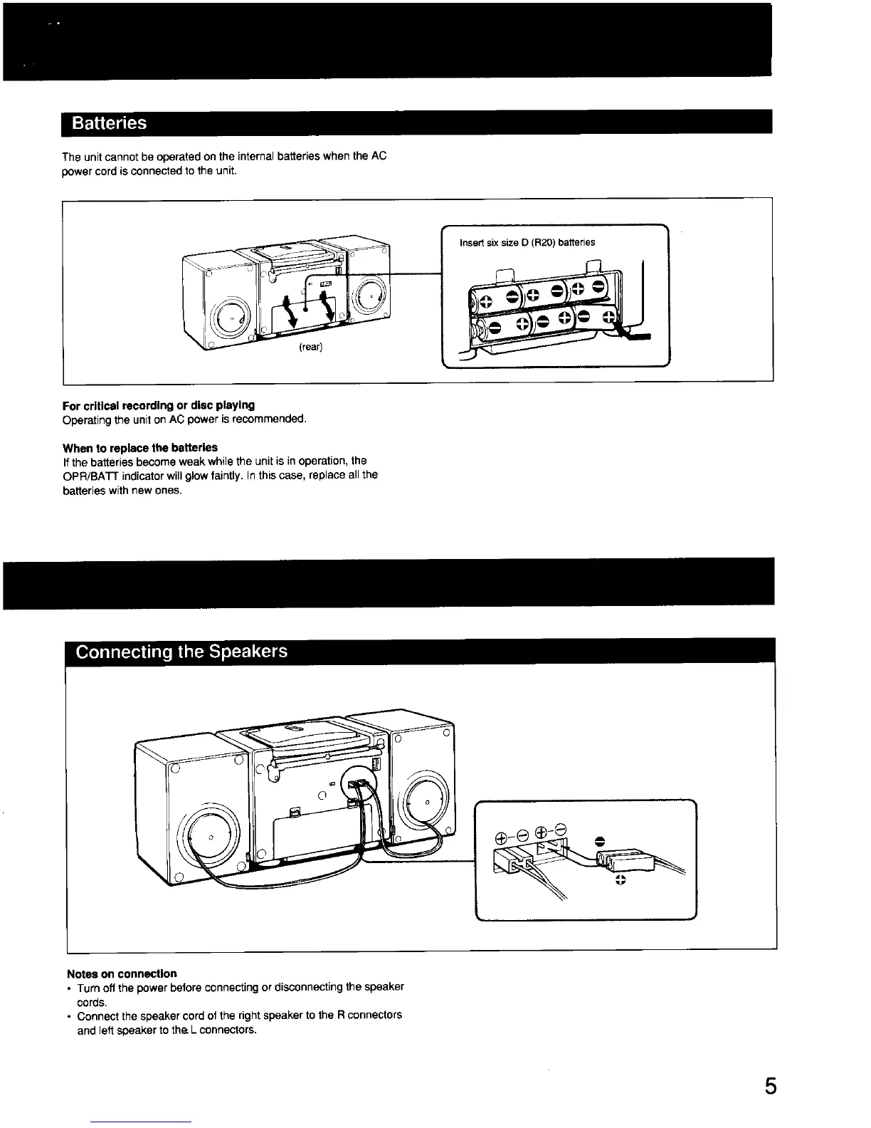 Sony CFD-440 - Battery Installation; Inserting D-Size Batteries; Battery Replacement Indicator; Connecting the Speakers