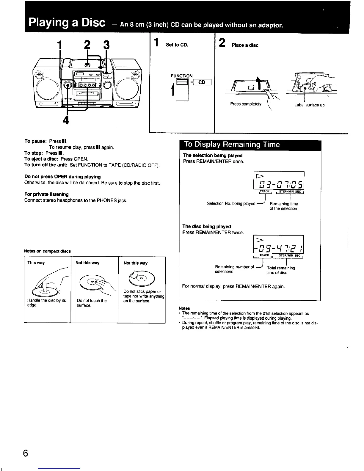 Sony CFD-440 - Playing a Disc; Basic Disc Playback Controls; Displaying Disc Time Information; Compact Disc Handling Tips