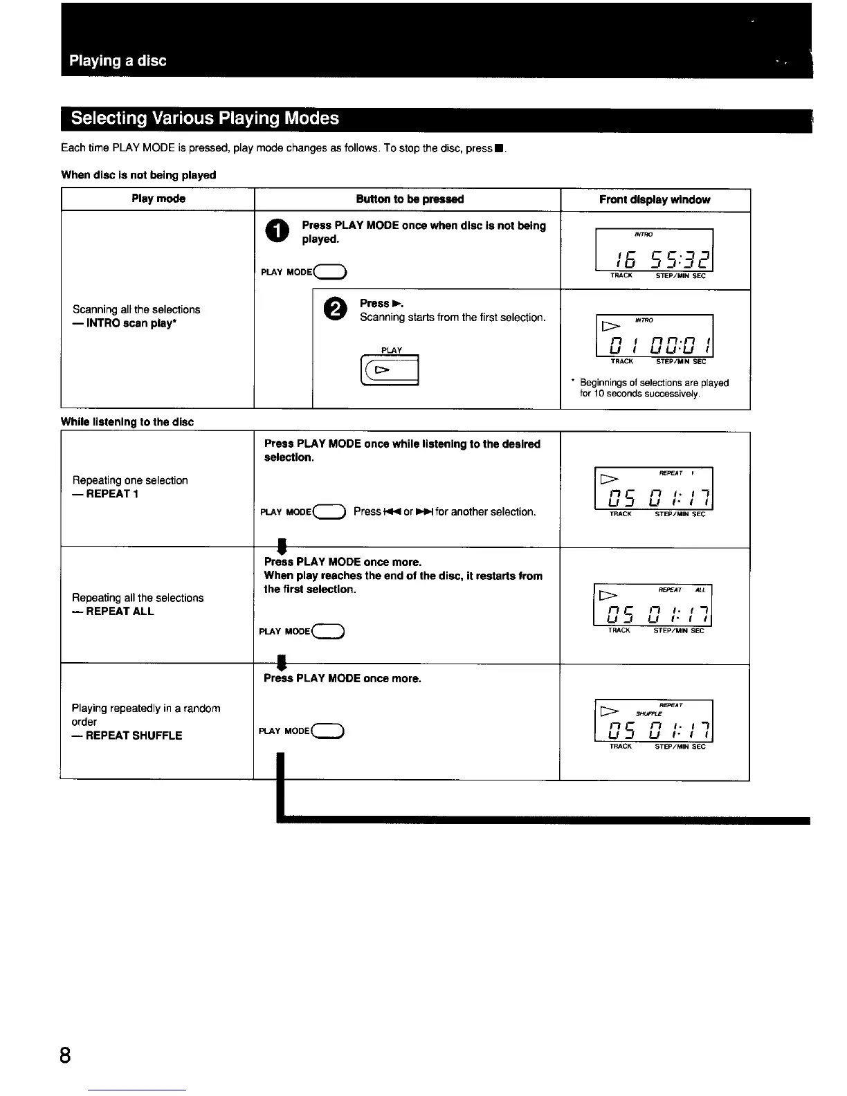 Sony CFD-440 - Disc Playback Modes; Intro Scan and Repeat Play Modes; Shuffle Playback Mode