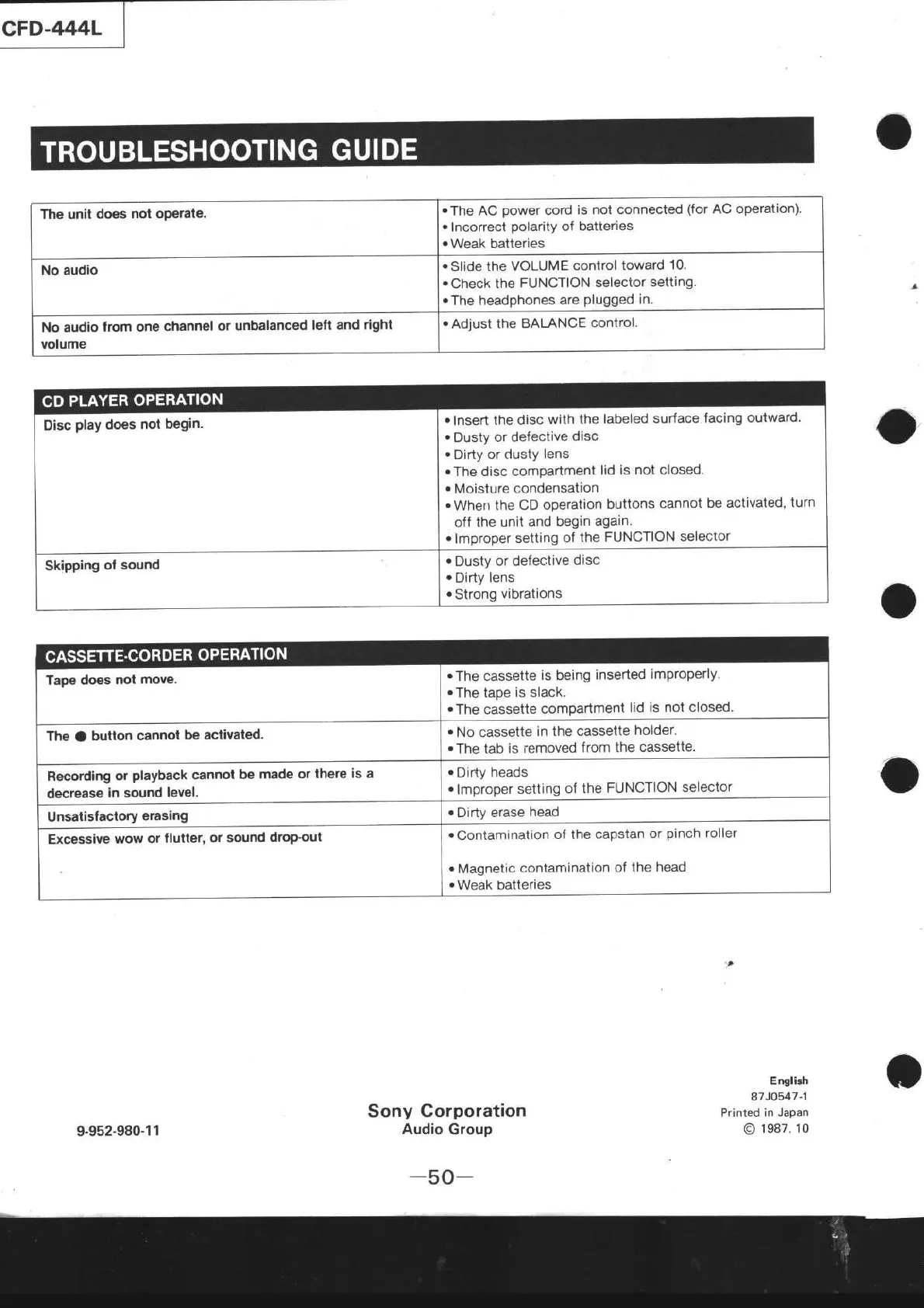 Sony CFD-444L - TROUBLESHOOTING GUIDE; CD PLAYER OPERATION; CASSETTE-CORDER OPERATION
