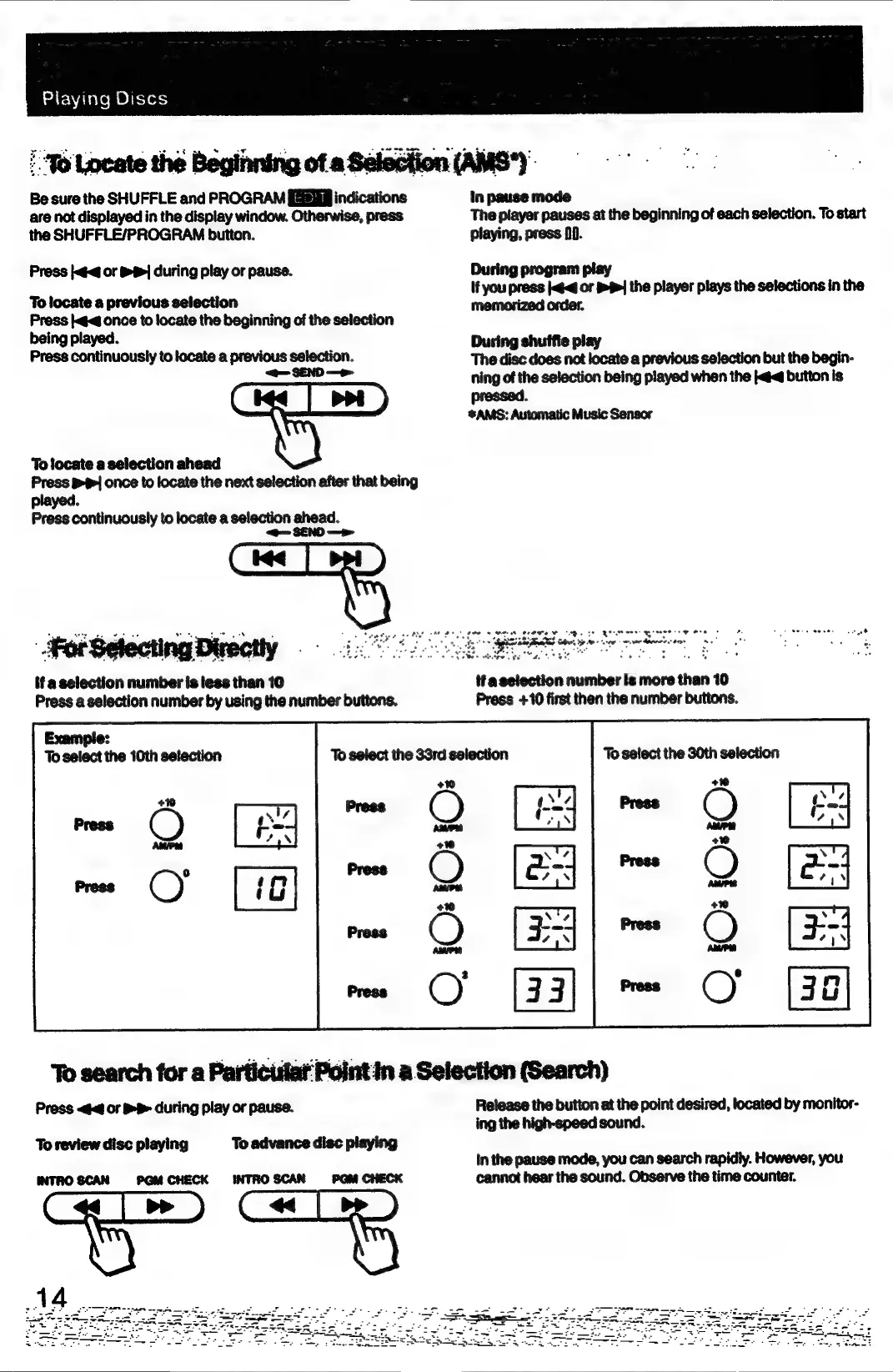 Sony CFD-765 - To Locate the Beginning of a Selection (AMS); For Selecting Directly; To search for a Particular Point in a Selection (Search)