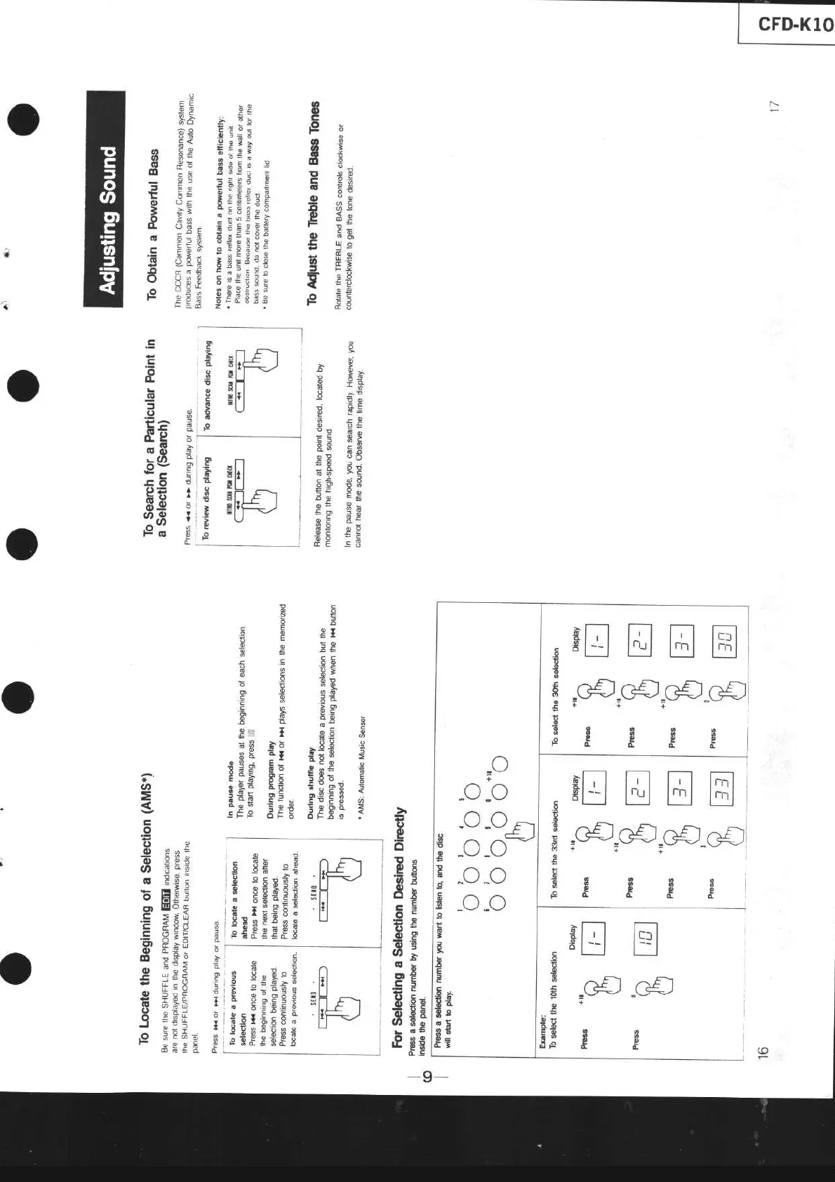 Sony CFD-K10 - Adjusting Sound; To Locate the Beginning of a Selection; For Selecting a Selection Desired Directly; To Obtain a Powerful Bass