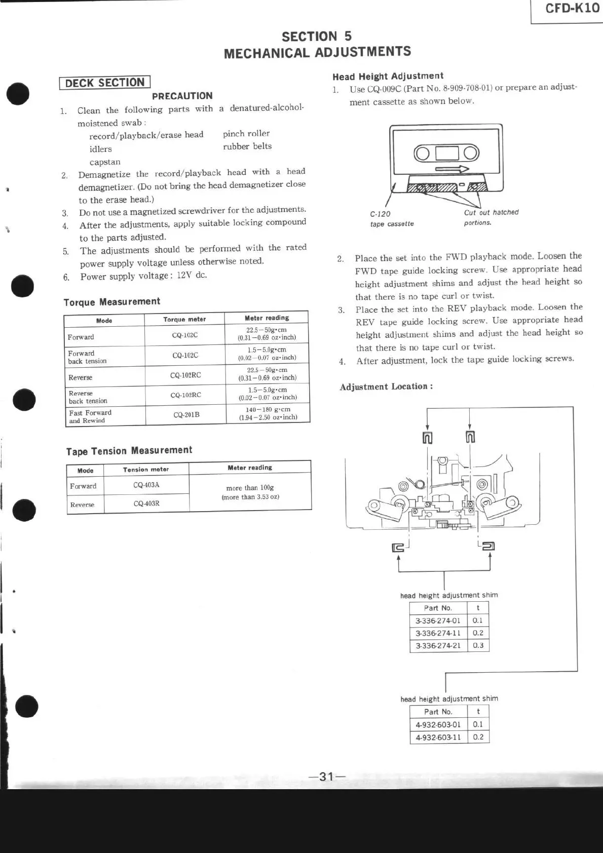 Sony CFD-K10 - Mechanical Adjustments; Precaution; Torque Measurement; Head Height Adjustment
