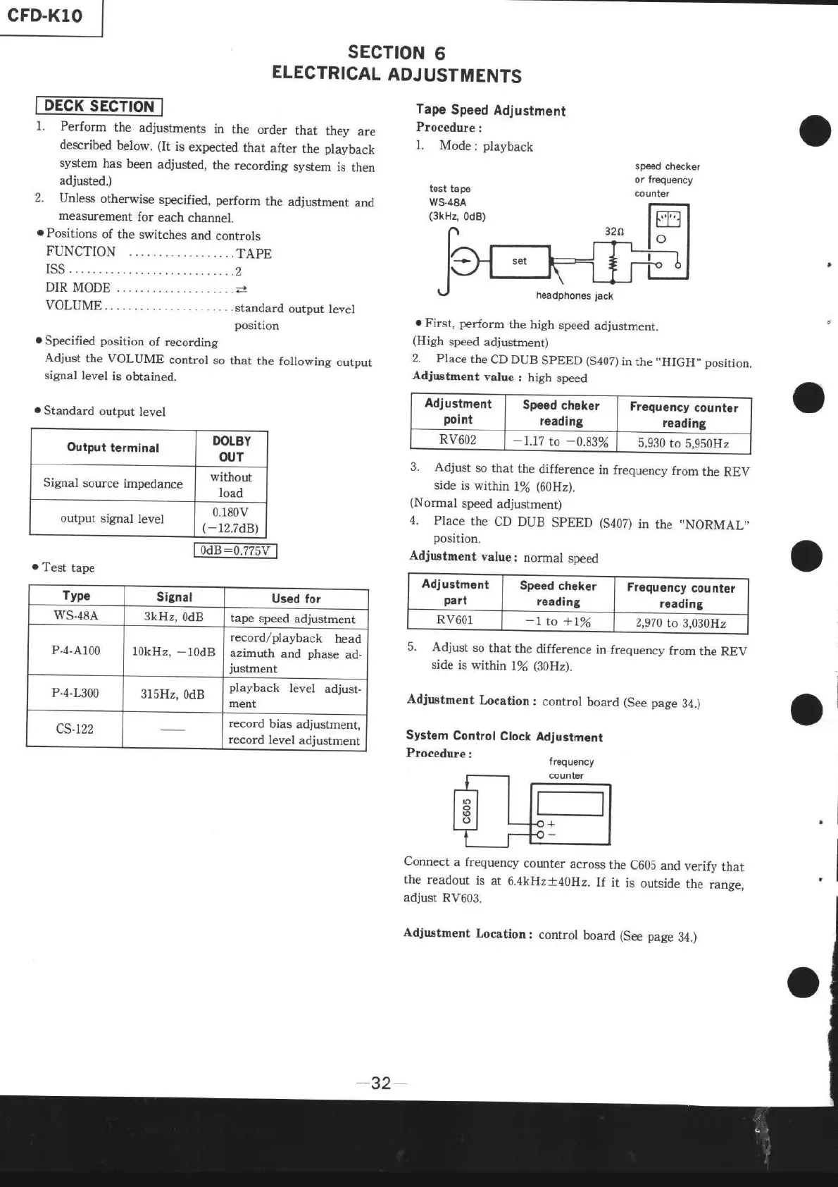 Sony CFD-K10 - Electrical Adjustments; Tape Speed Adjustment; System Control Clock Adjustment; Test Tape