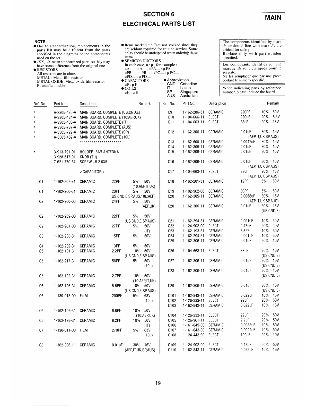 Sony CFM-10 - Electrical Components List; Main Electrical Components