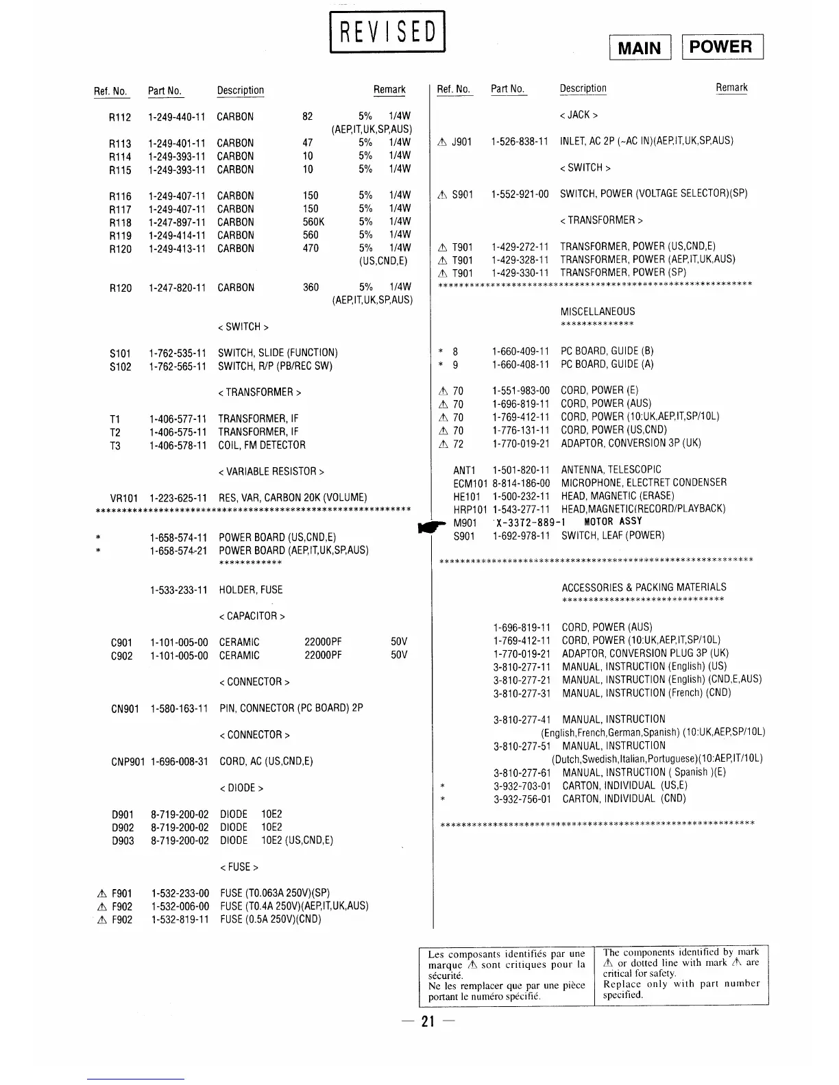 Sony CFM-10 - Power and Miscellaneous Parts Lists; Power Supply Components; Miscellaneous Components