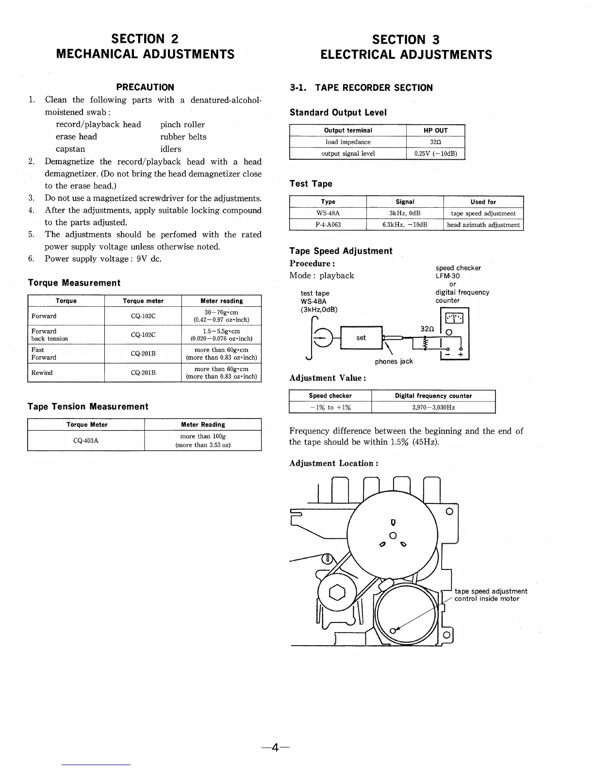 Sony CFS-200 - SECTION 2 MECHANICAL ADJUSTMENTS; PRECAUTION; Torque Measurement; Tape Tension Measurement