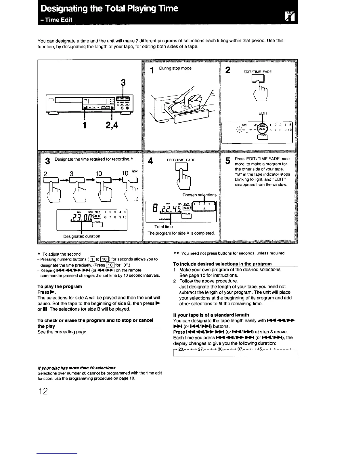 Sony Compact disc player - Time Edit Function; Setting Total Playing Time for Tapes; Playing and Managing Time Edit Programs