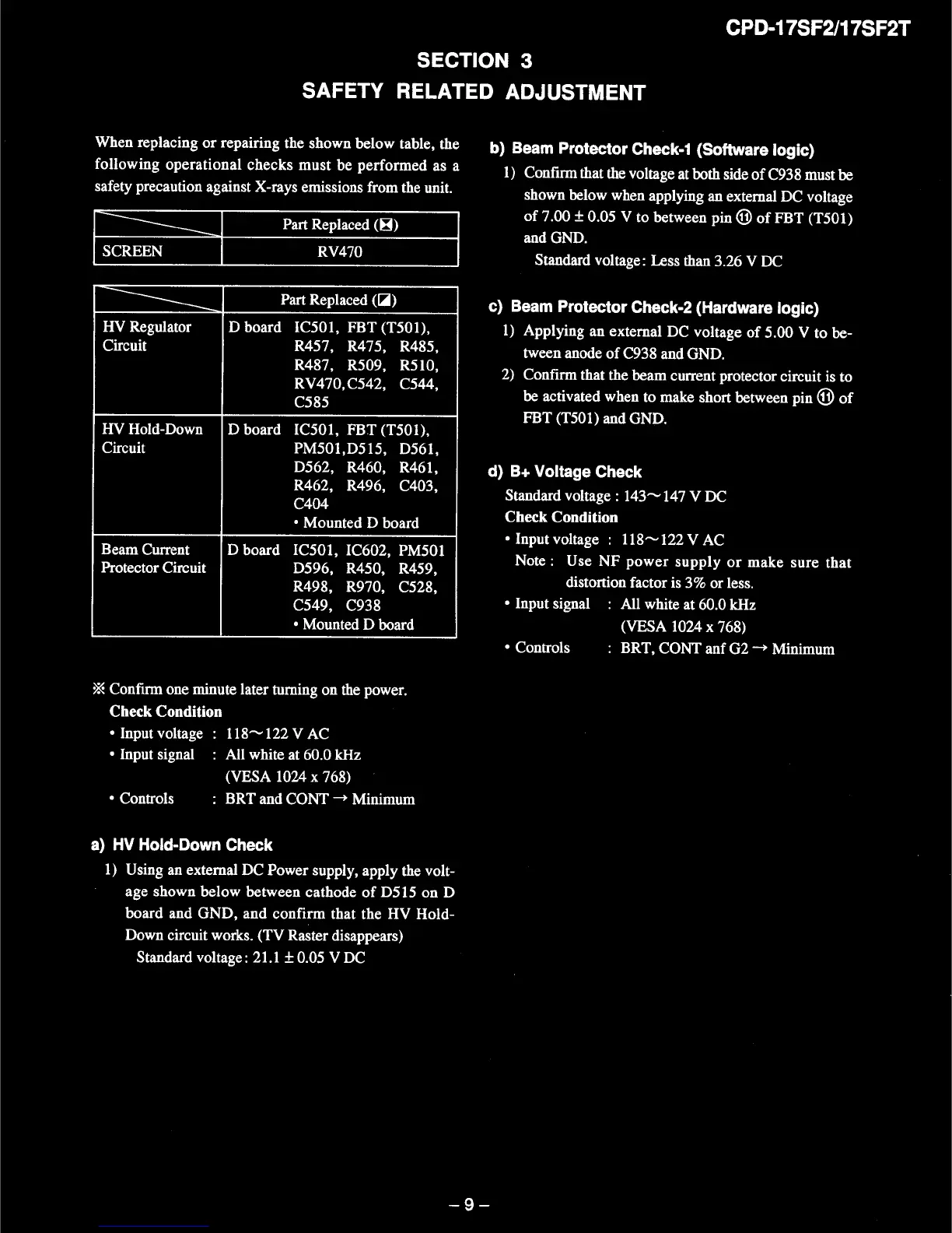 Sony CPD-17SF2 - Safety Related Adjustment; HV Hold-Down Check; Beam Protector Check; B+ Voltage Check