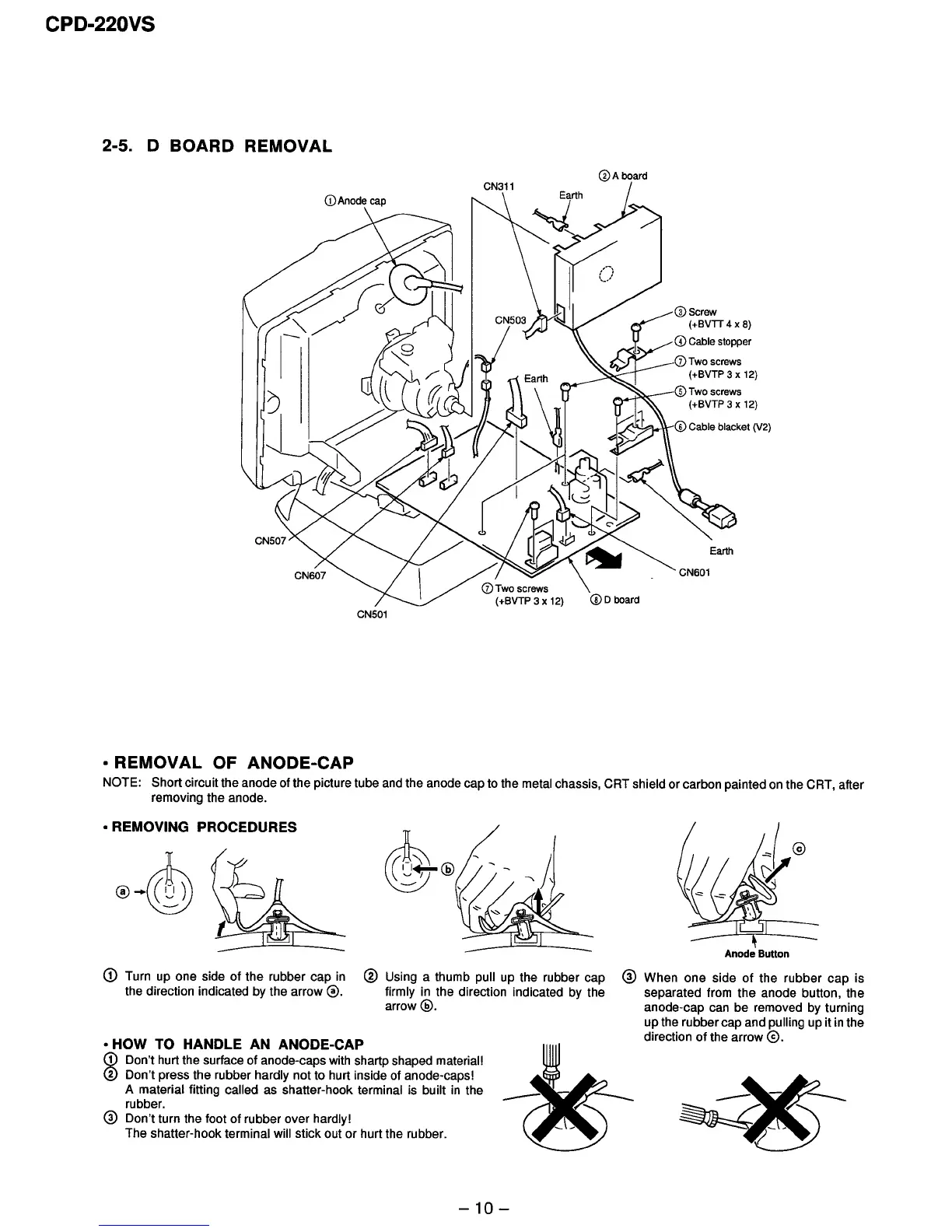 Sony CPD-220VS - D Board Removal; Removal of Anode-Cap; Removing Procedures; How to Handle an Anode-Cap
