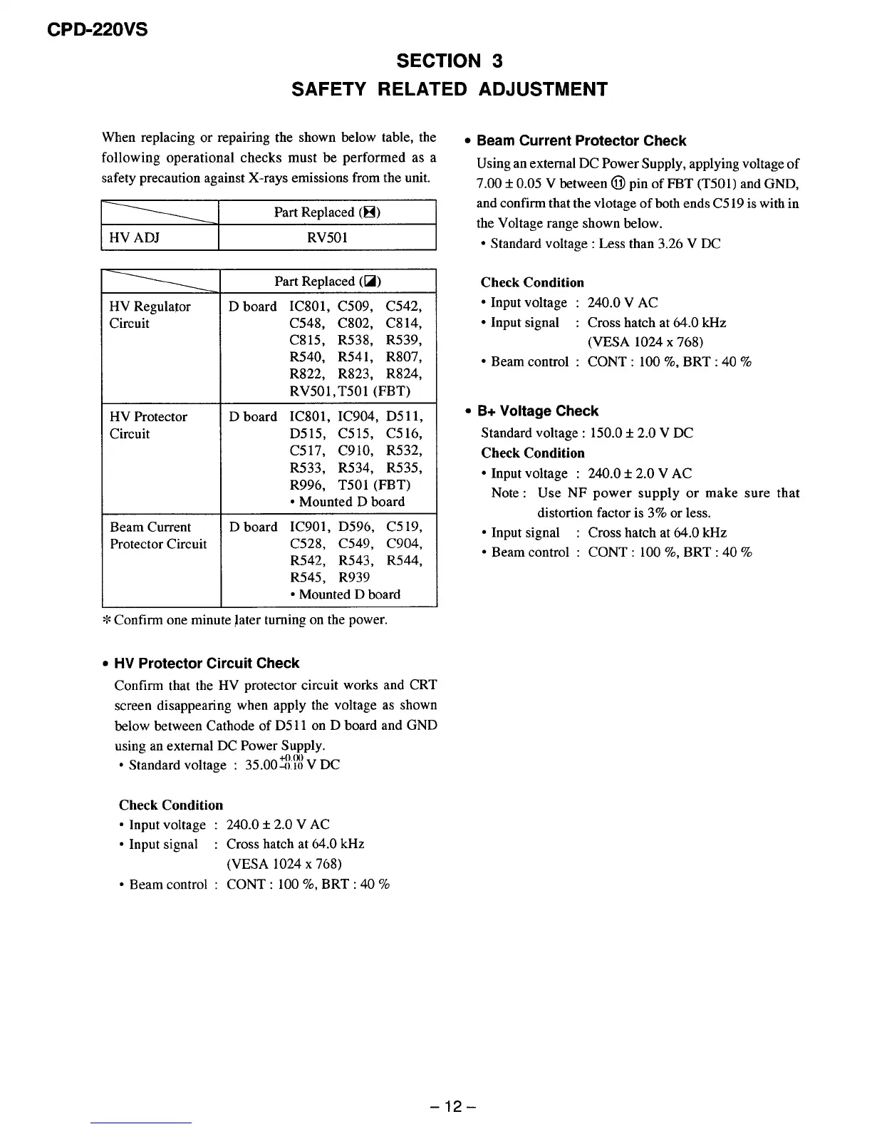 Sony CPD-220VS - Safety Related Adjustment; HV Protector Circuit Check; Beam Current Protector Check; V+ Voltage Check