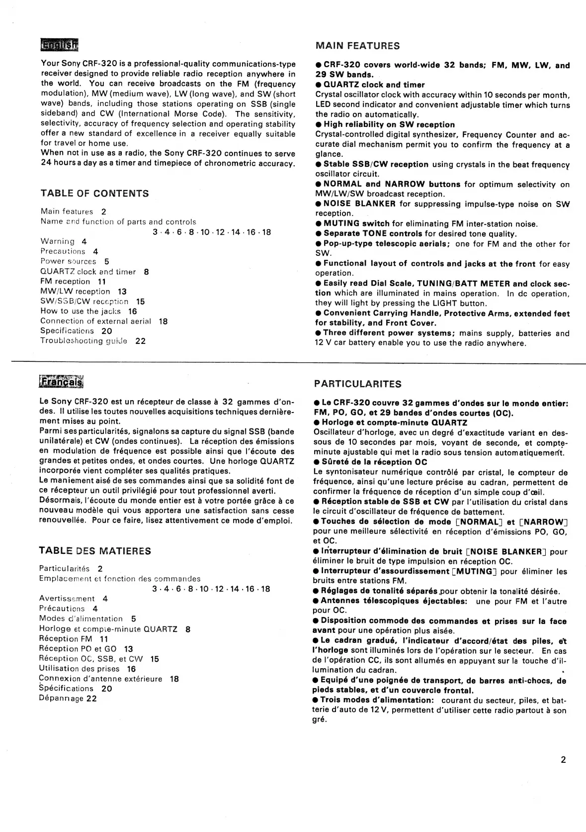 Sony CRF-320 - Table of Contents; Main Features; Particularités