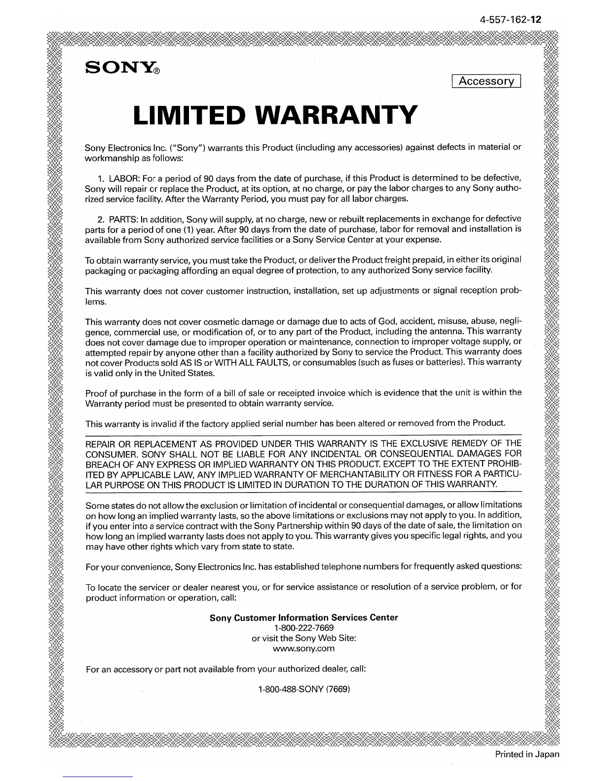 Sony CSS-PHA - Sony Product Limited Warranty; Warranty Coverage: Labor; Warranty Coverage: Parts