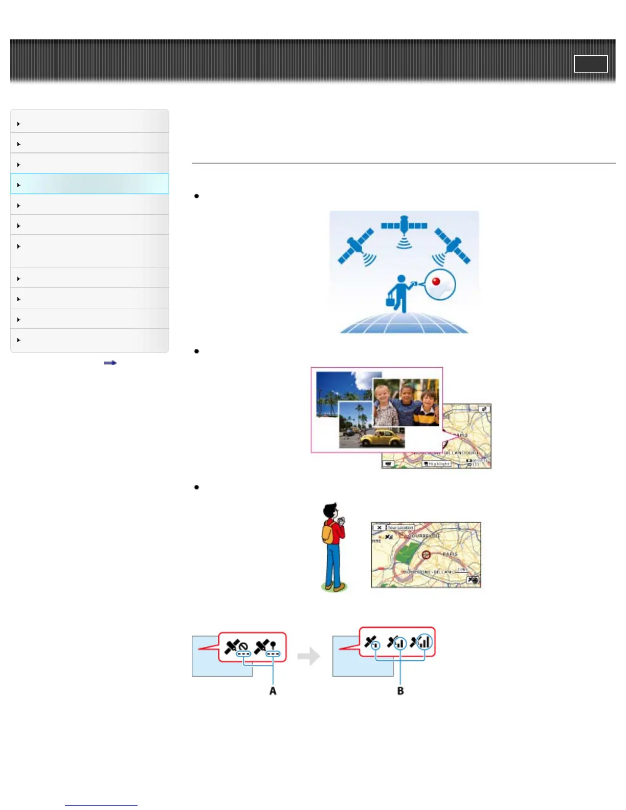 Top page > Recording > Recording information on your location (GPS) > Features available using GPS