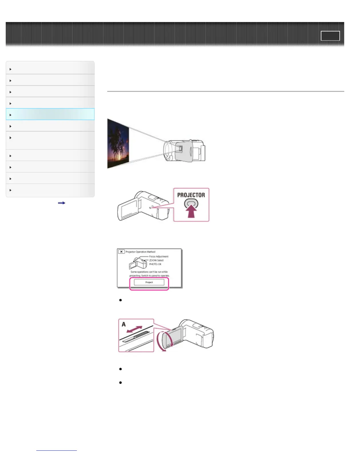 Top page > Playback > Using the built-in projector > Using the built-in projector (Models with a