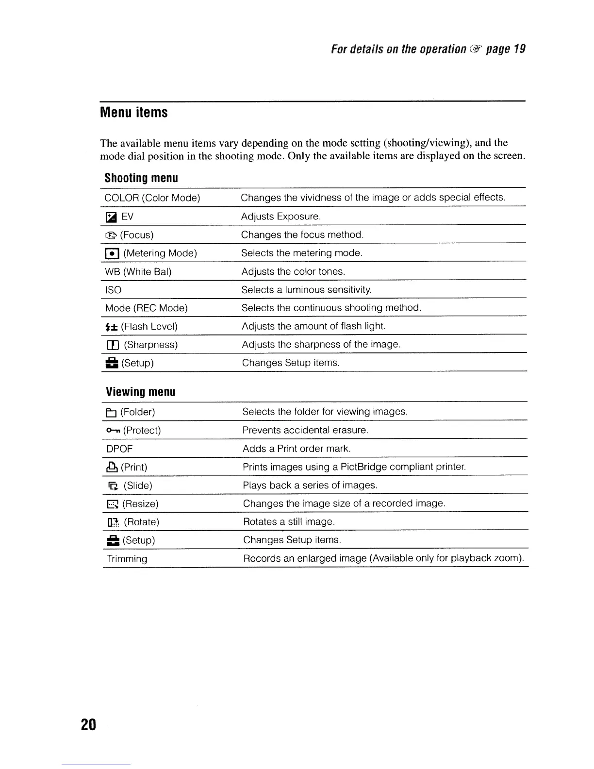 mode dial position in the shooting mode. Only the available items are displayed on the screen.