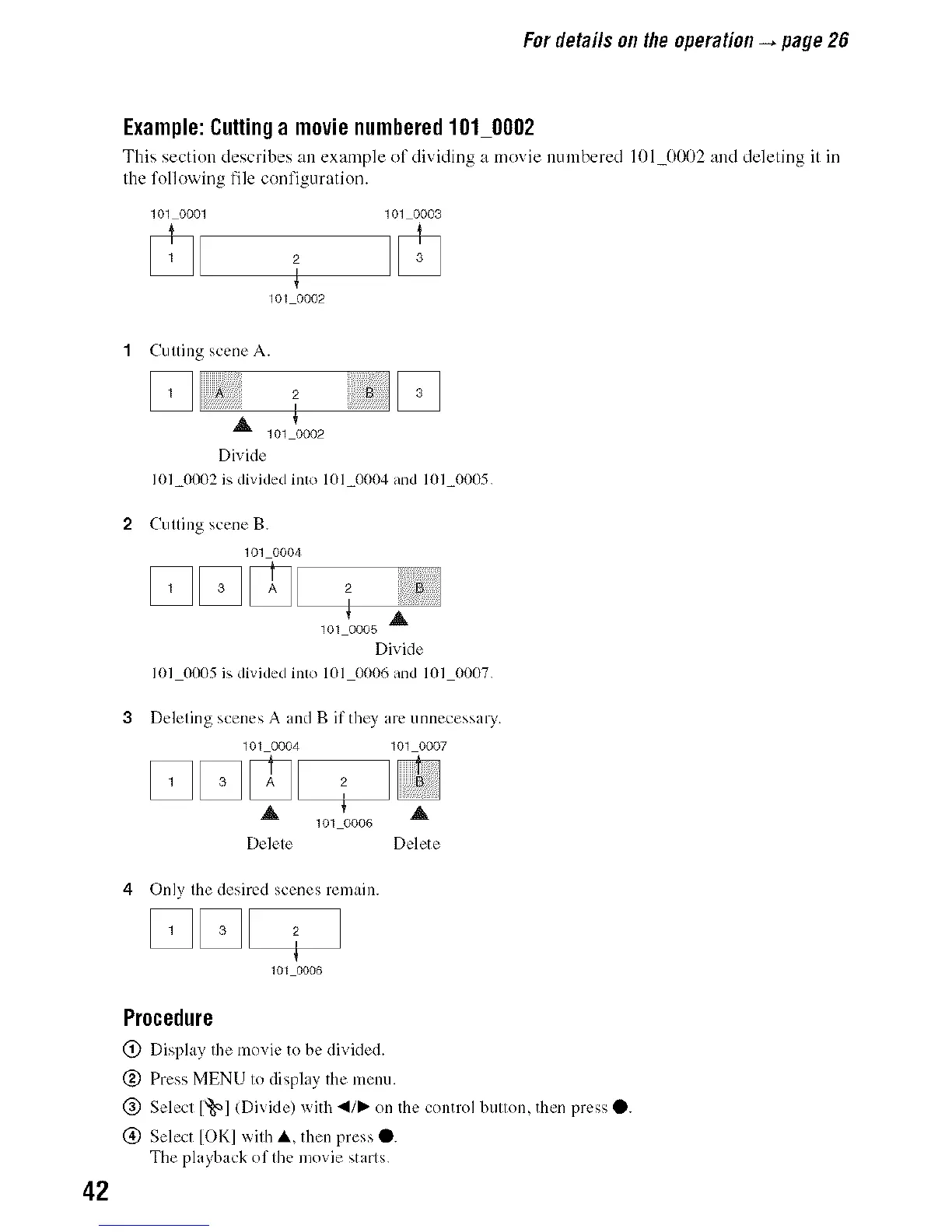 This section describes an example of dividing a movie numbered 101_0002 o.nd deleting it in