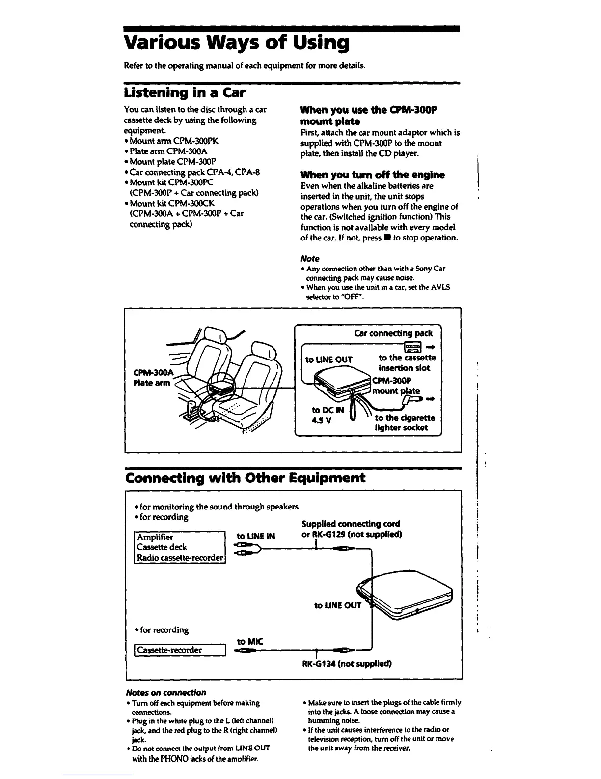 Sony D-231 - Various Ways of Using; Listening in a Car; Connecting with Other Equipment