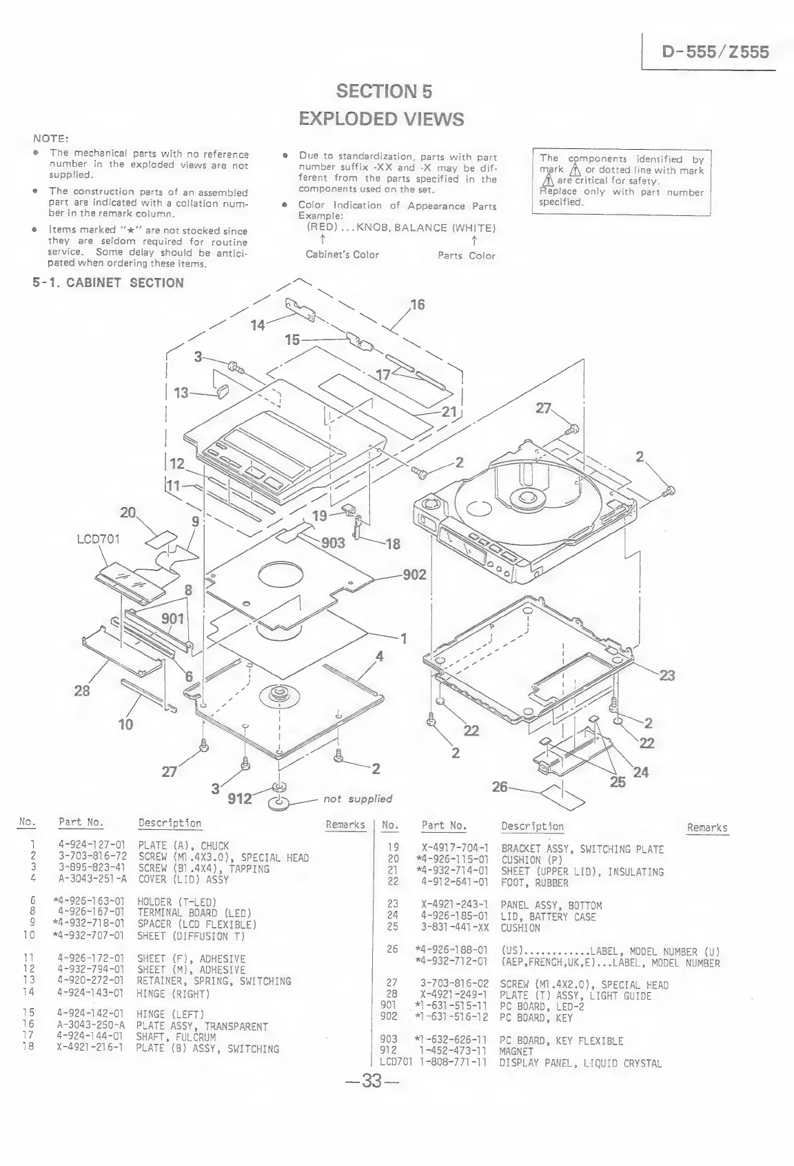 Sony D-555 - Exploded Views - Cabinet Section; Cabinet Parts List