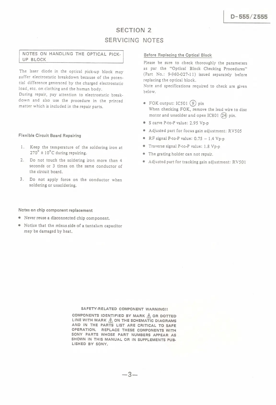 Sony D-555 - Servicing Notes and Precautions; Handling Optical Pick-up Block; Flexible Circuit Board Repair; Chip Component Replacement