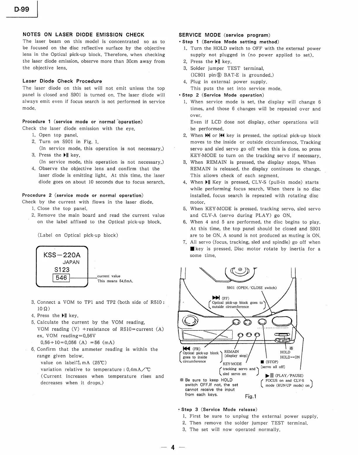 Sony D-99 - Service Mode Operations; Laser Diode Emission Check Procedures; Service Mode Setting Method; Service Mode Operation Steps