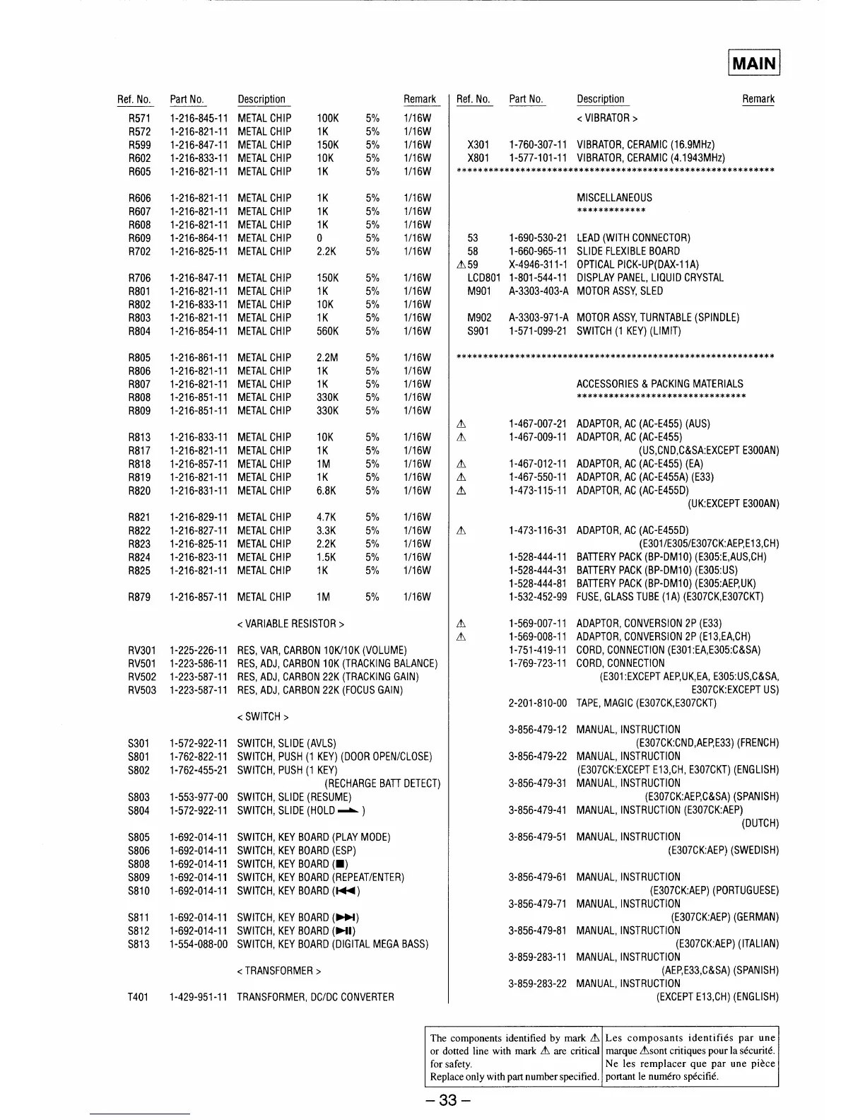Sony D-E300AN - Electrical Parts List - Switches and Transformers; Switches, Transformers, and Miscellaneous Parts