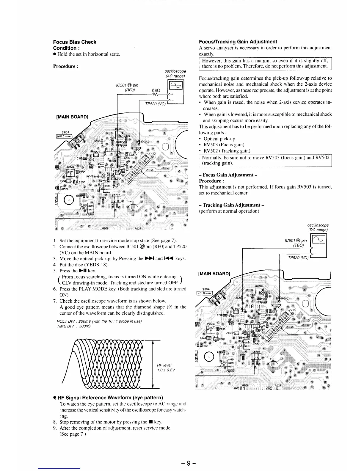 Sony D-E300AN - Focus Bias and Gain Adjustments; Focus Bias Check; Focus and Tracking Gain Adjustment