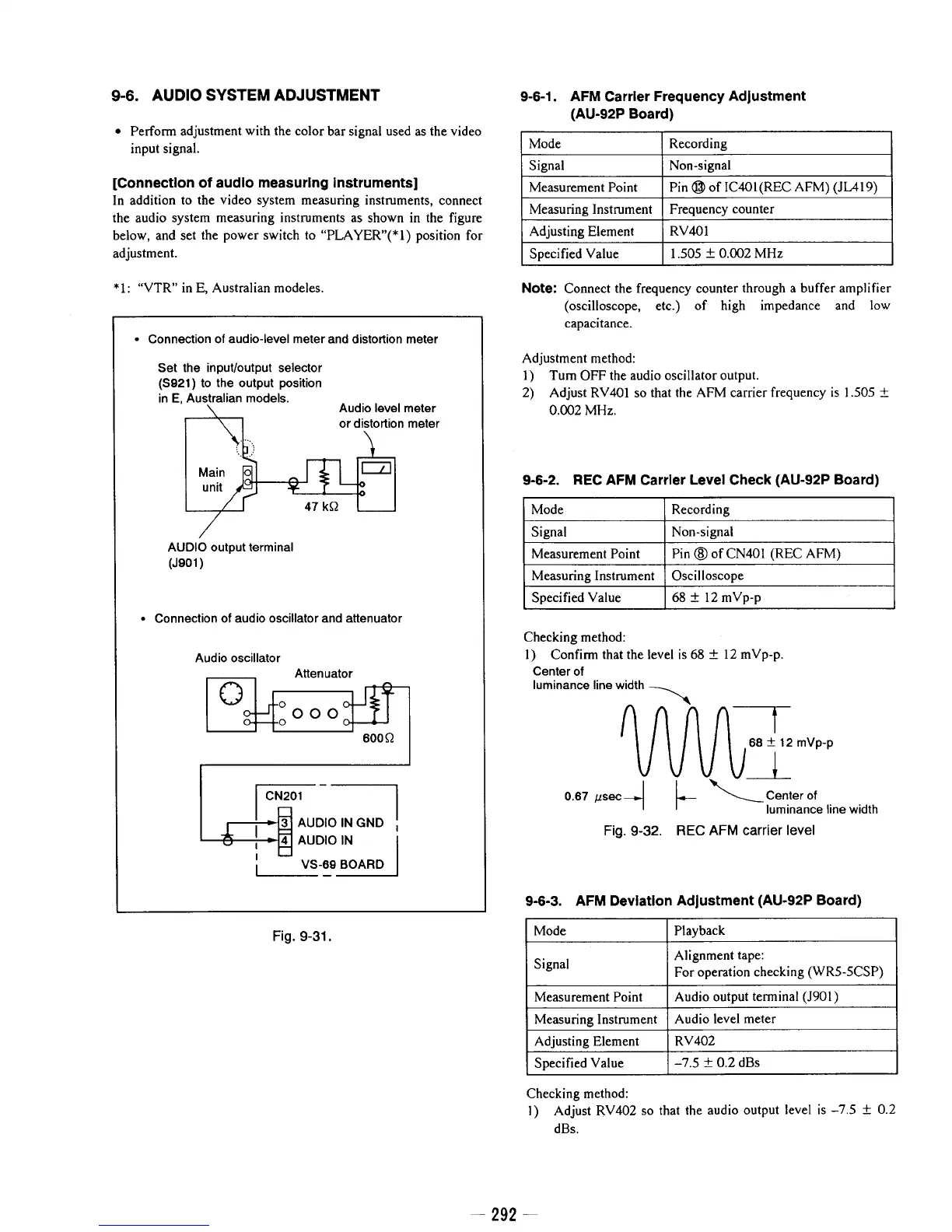 Sony ??D-TR50E - Audio System Adjustment; AFM Carrier Frequency Adjustment (AU-92 P Board); REC AFM Carrier Level Check (AU-92 P Board); AFM Deviation Adjustment
