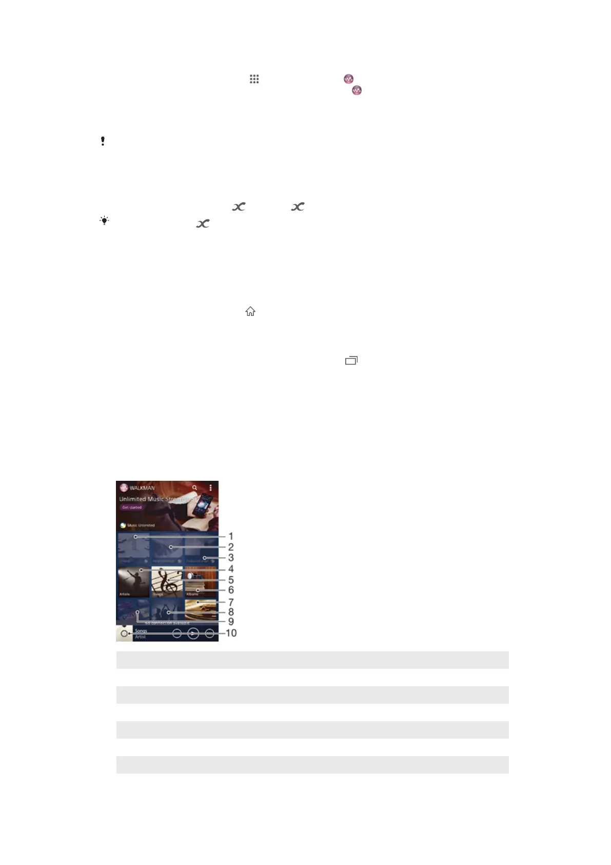 • When a song is playing, tap to go to the Home screen. The "WALKMAN"