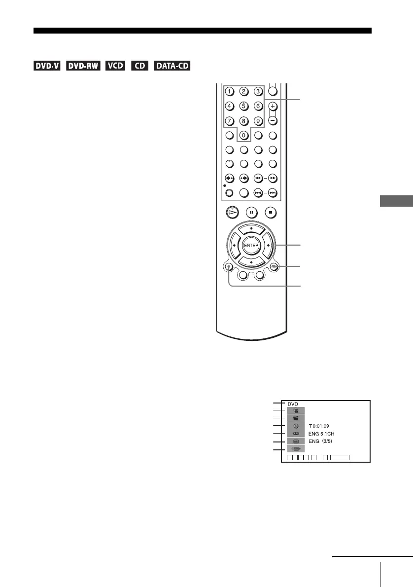 Press DISPLAY during playback. The following information appears; type of disc,