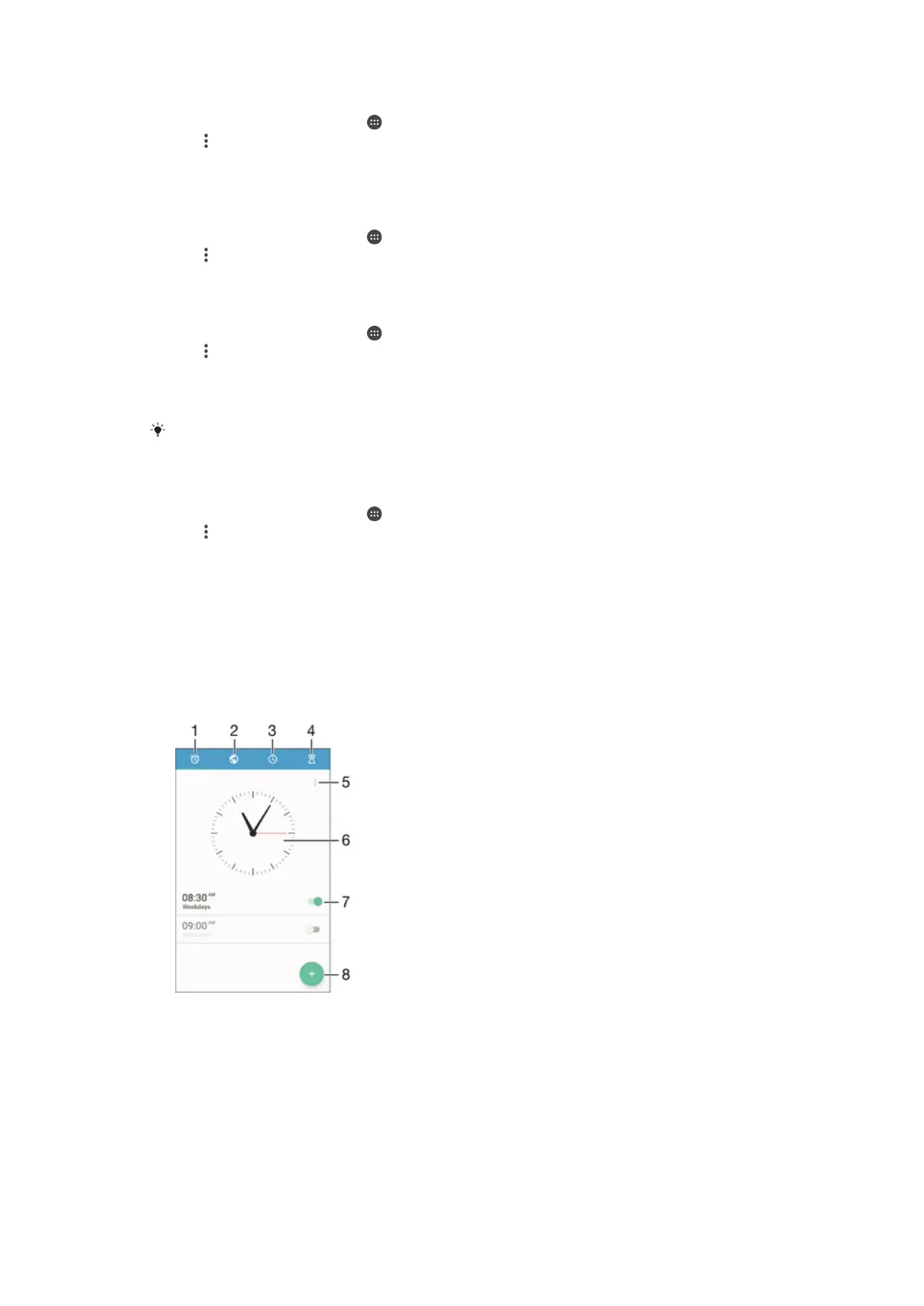 You can set one or several alarms and use any sound saved on your device as the alarm