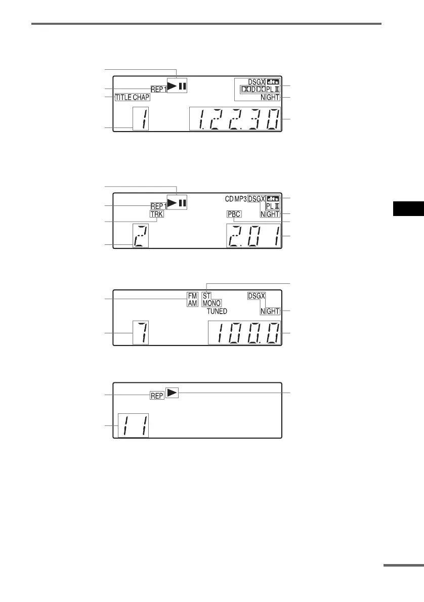 Sony DAV-BC150 - Front Panel Display Indicators; DVD Playback Display; CD;MP3;VIDEO CD Playback Display; Radio and JPEG Playback Display