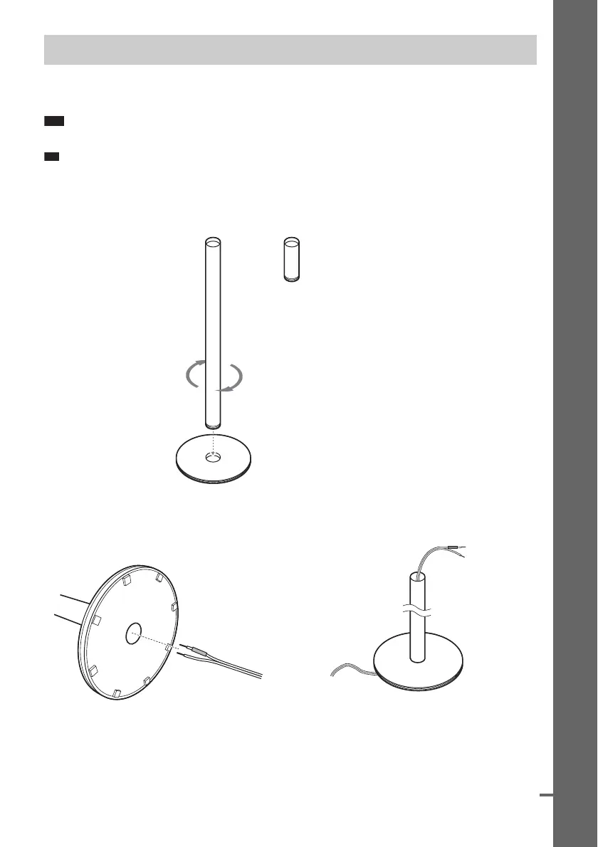2 Draw the speaker cord through the hole on the base, then stand it up.
