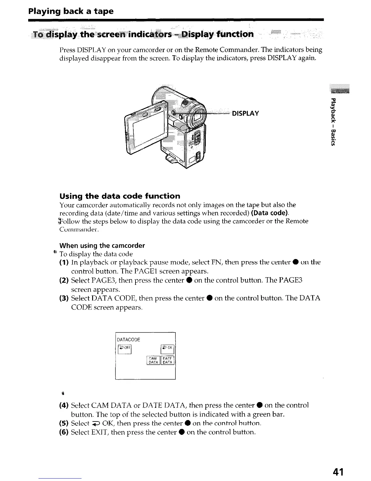 hollow the steps below to display the data code using the camcorder or the Remote