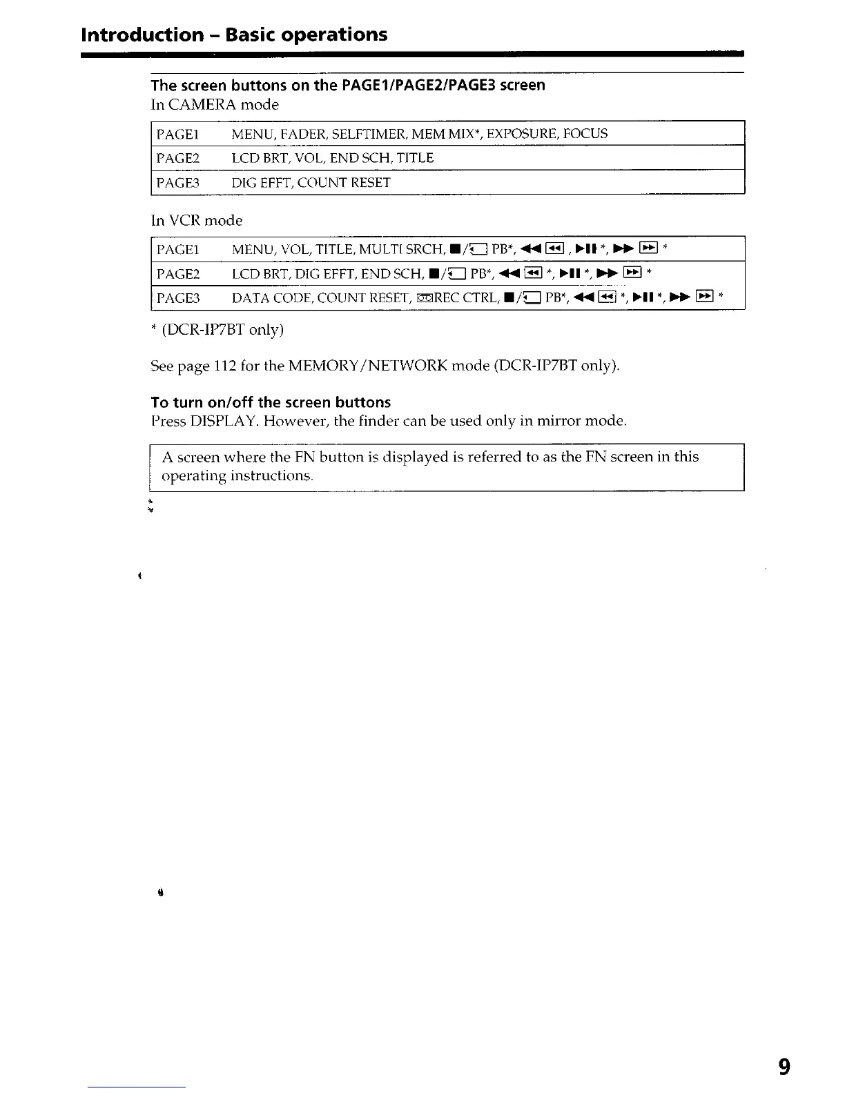 See page 112 for the MEMORY/NETWORK mode (DCR-IP7BT only).