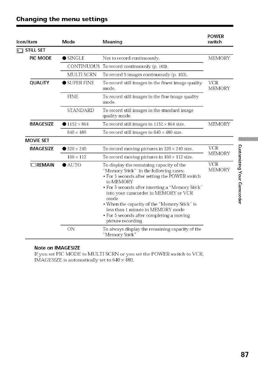 IMAGESIZE • 1152 × 864 To record still images in 1152 × 864 size. MEMORY
