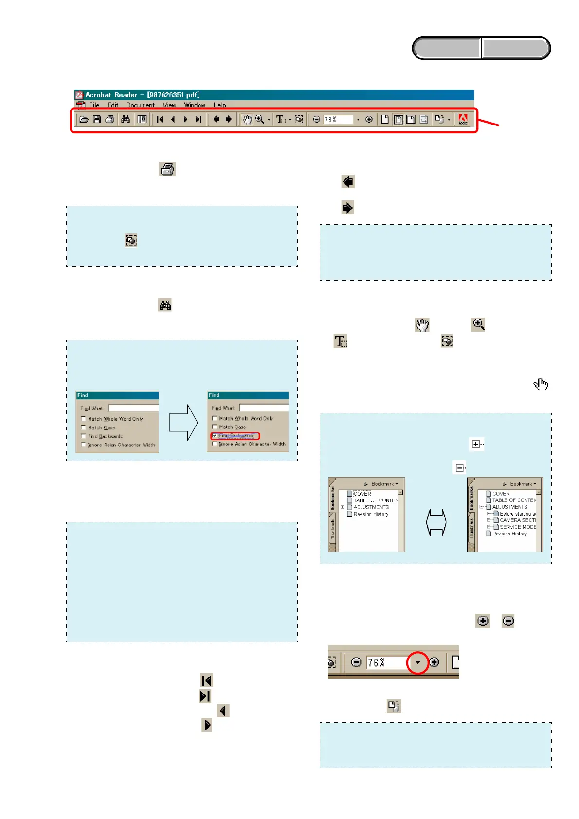 [Description of main button functions on toolbar of the Adobe Acrobat Reader Ver5.0 (for Windows)]