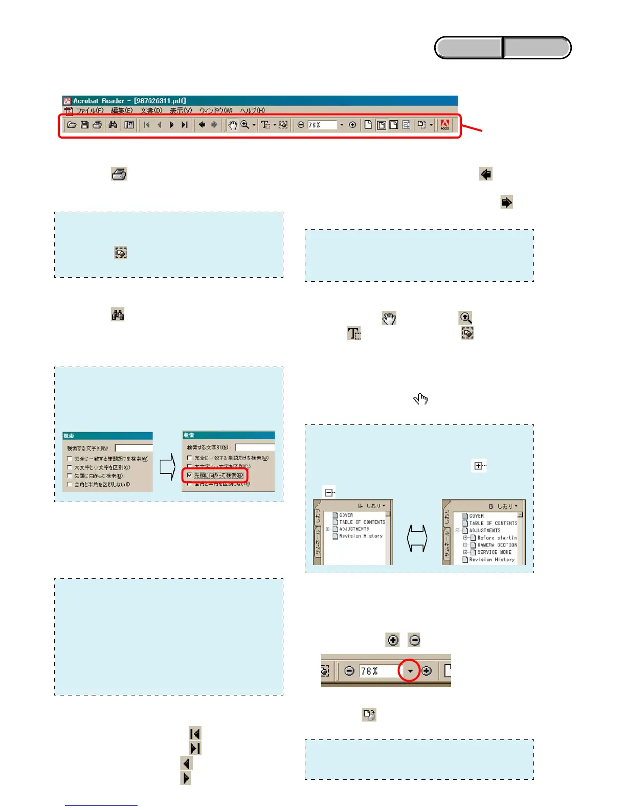 【AdobeAcrobatReaderVer5.0(forWindows)ツールバー内にある主なボタンの機能説明】