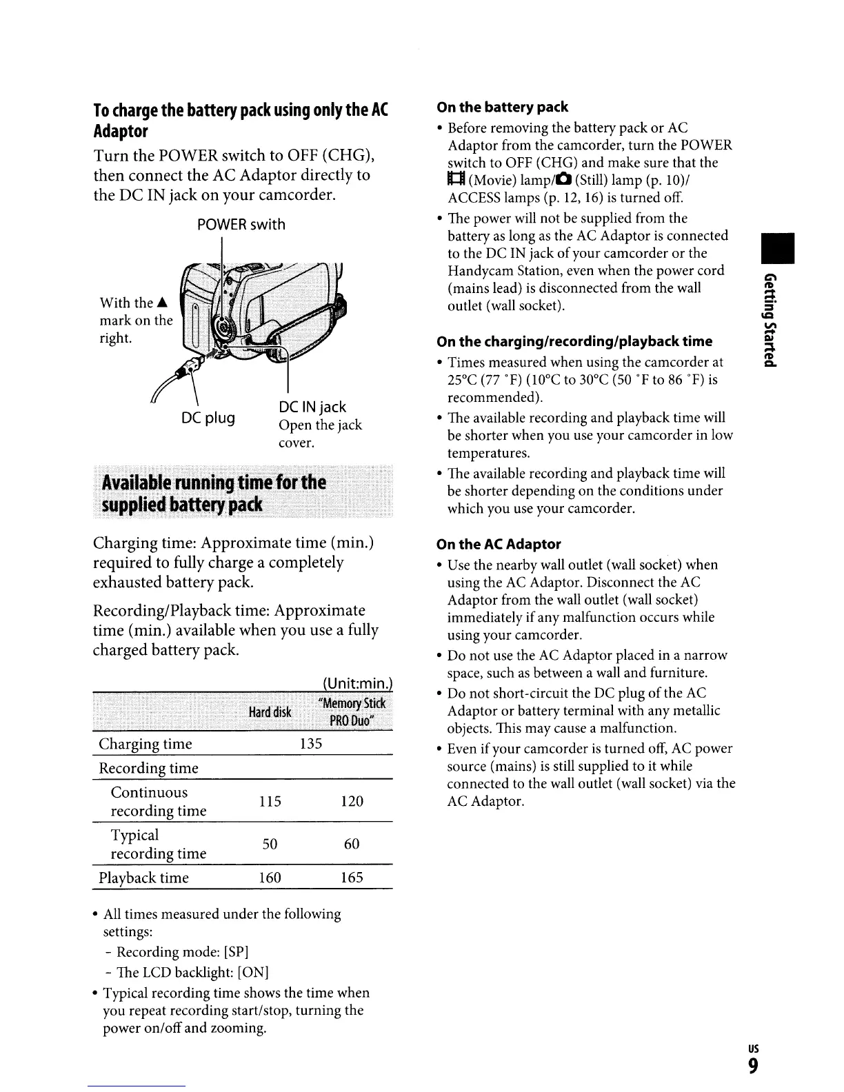 Adaptor from the camcorder, turn the POWER