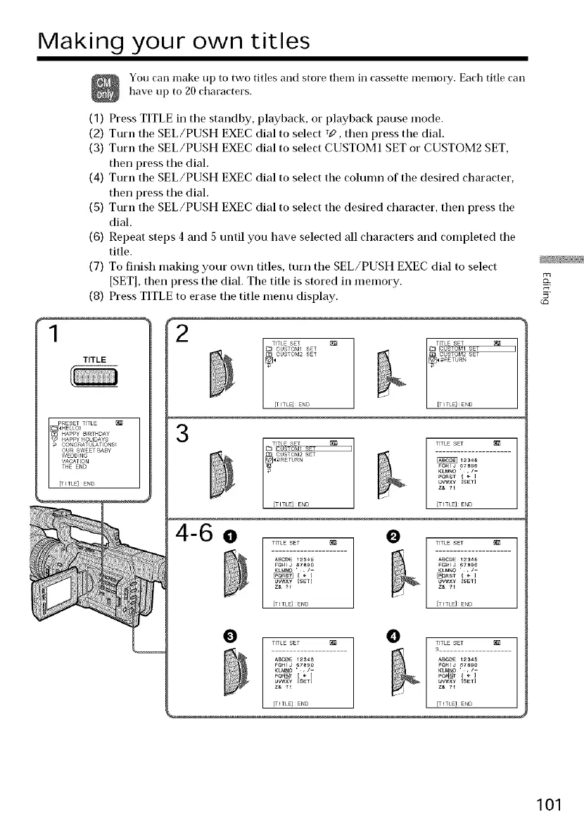 (7) To finish making your own titles, turn the SEL/PUSH EXEC dial to select