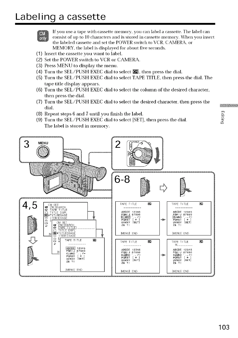 the labeled cassette and set the POWER switch to VCR, CAMERA, or