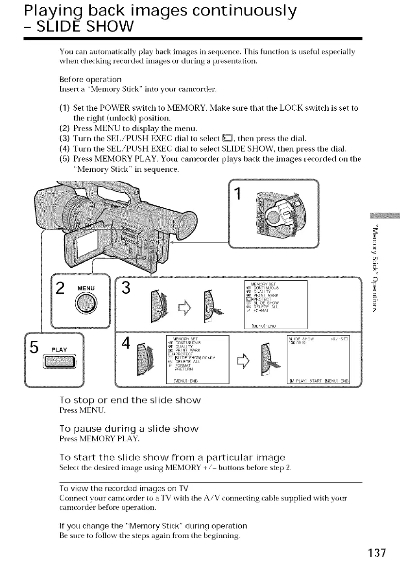 (S) Press MEMORY PLAY. Your camcorder plays back the images recorded on the