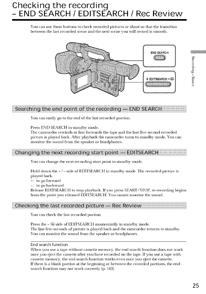 Tile camcorder rewinds or" fast-forwards tile tape and tile last five-second recorded