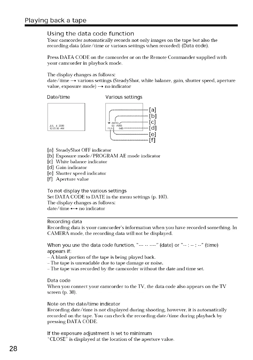 Press DATA CODE on tile camcorder or on tile Remote Commander supplied with