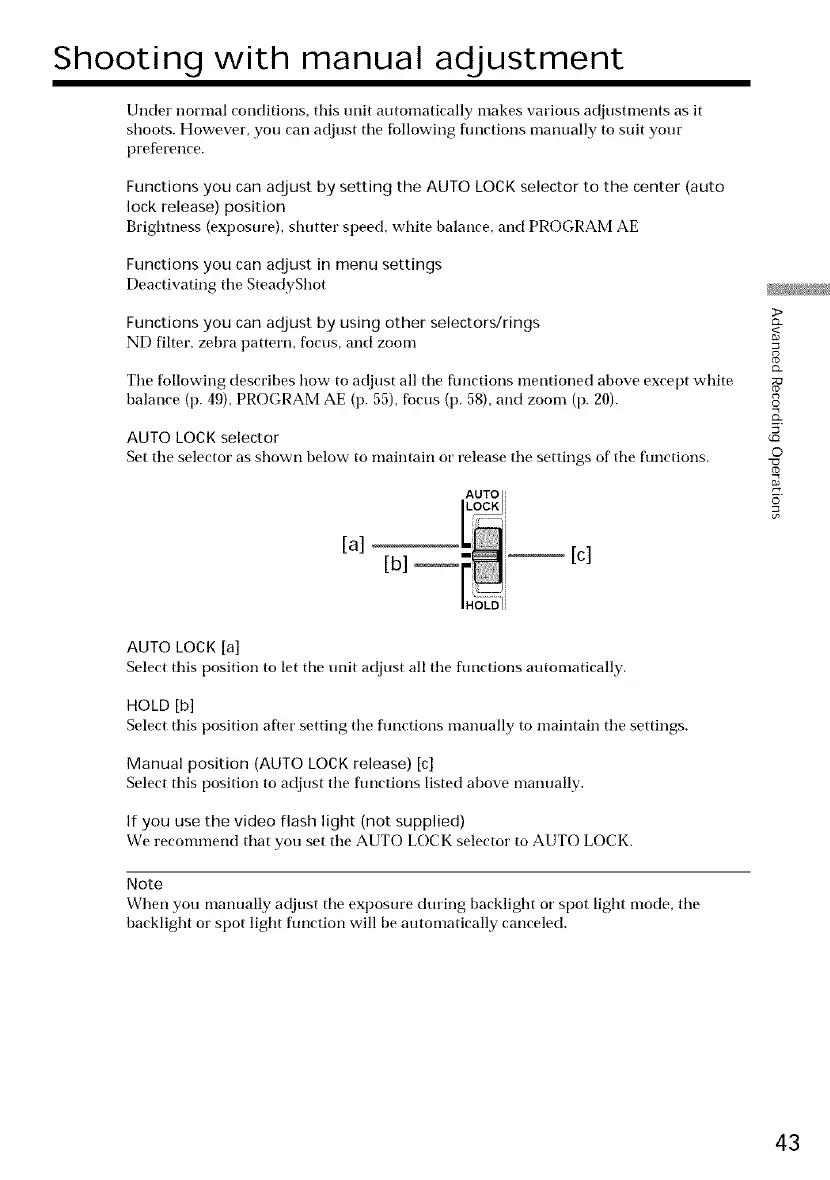 Functions you can adjust by setting the AUTO LOCK selector to the center (auto