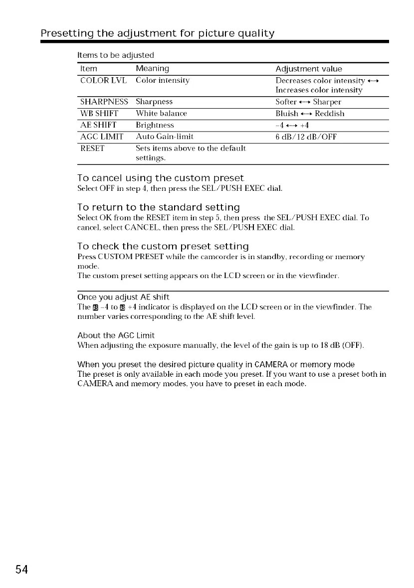 Press CUSTOM PRESET while tile camcorder is in standby, recording or memory