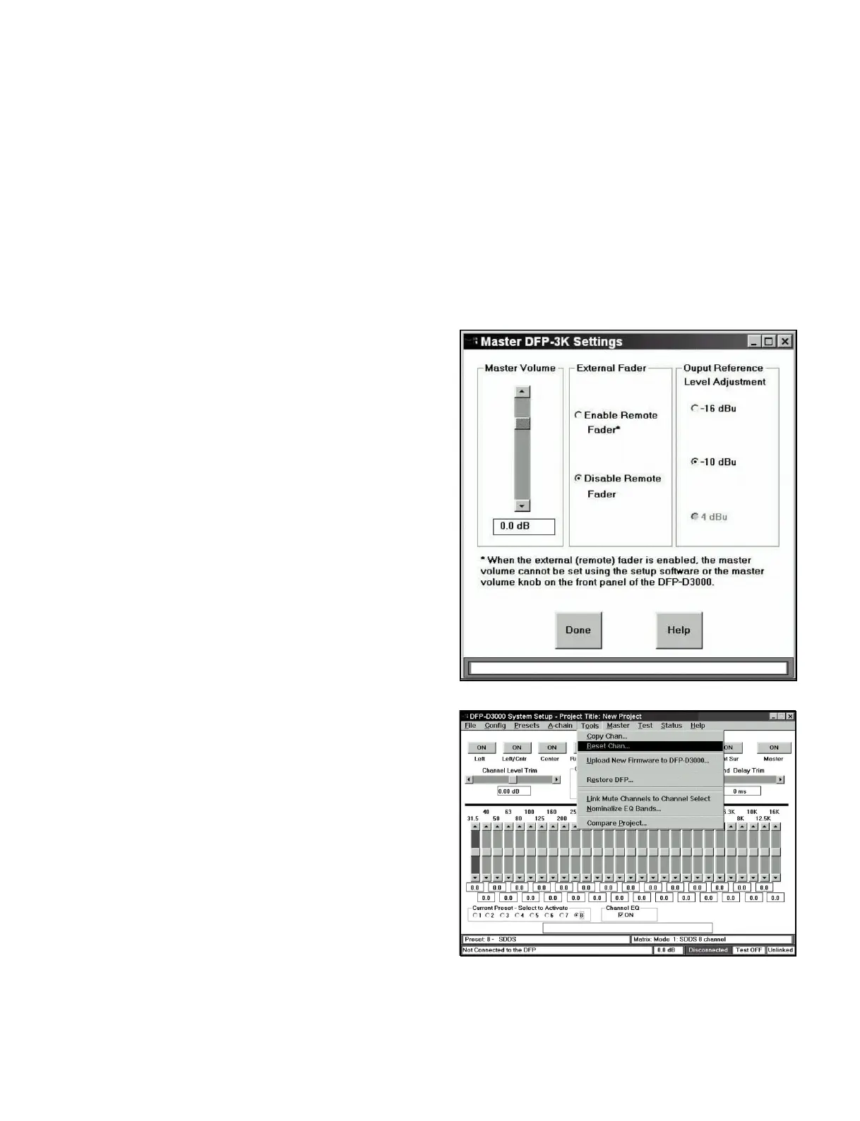 “connect” the Setup Software to the DFP-D3000 using the Config>Connect to DFP… menus. Set up