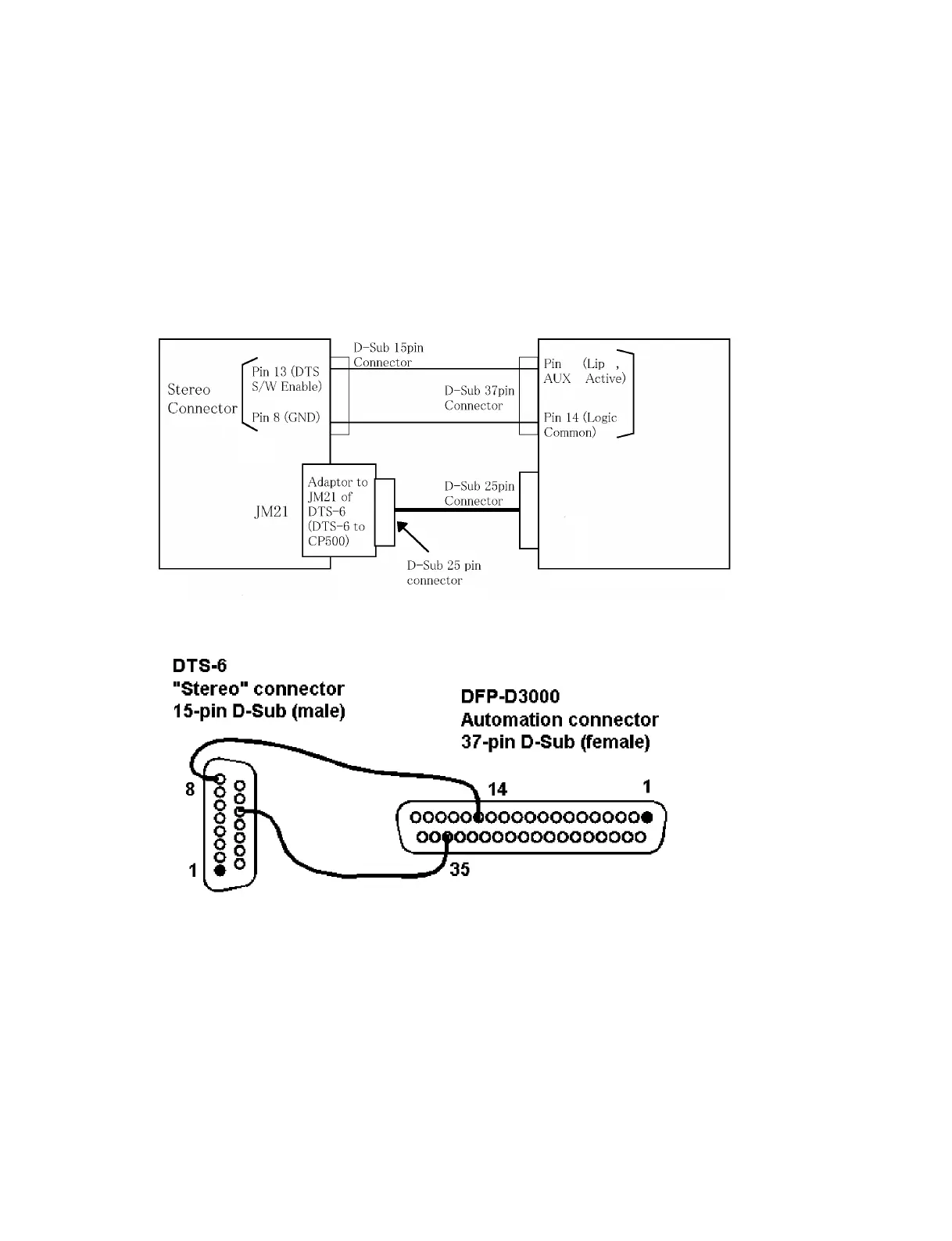 Connect Pin 8 (GND) of the DTS-6 STEREO connector and Pin 14 of the DFP-D3000 Automation